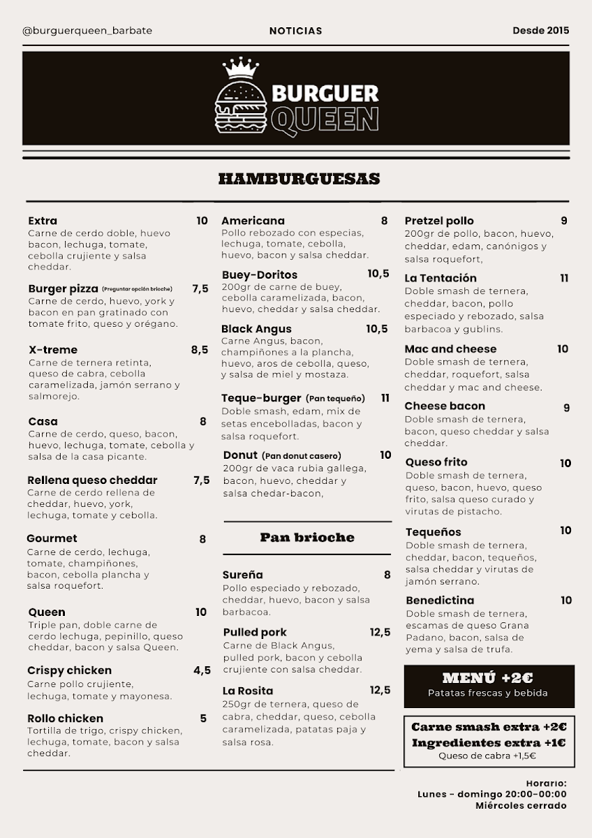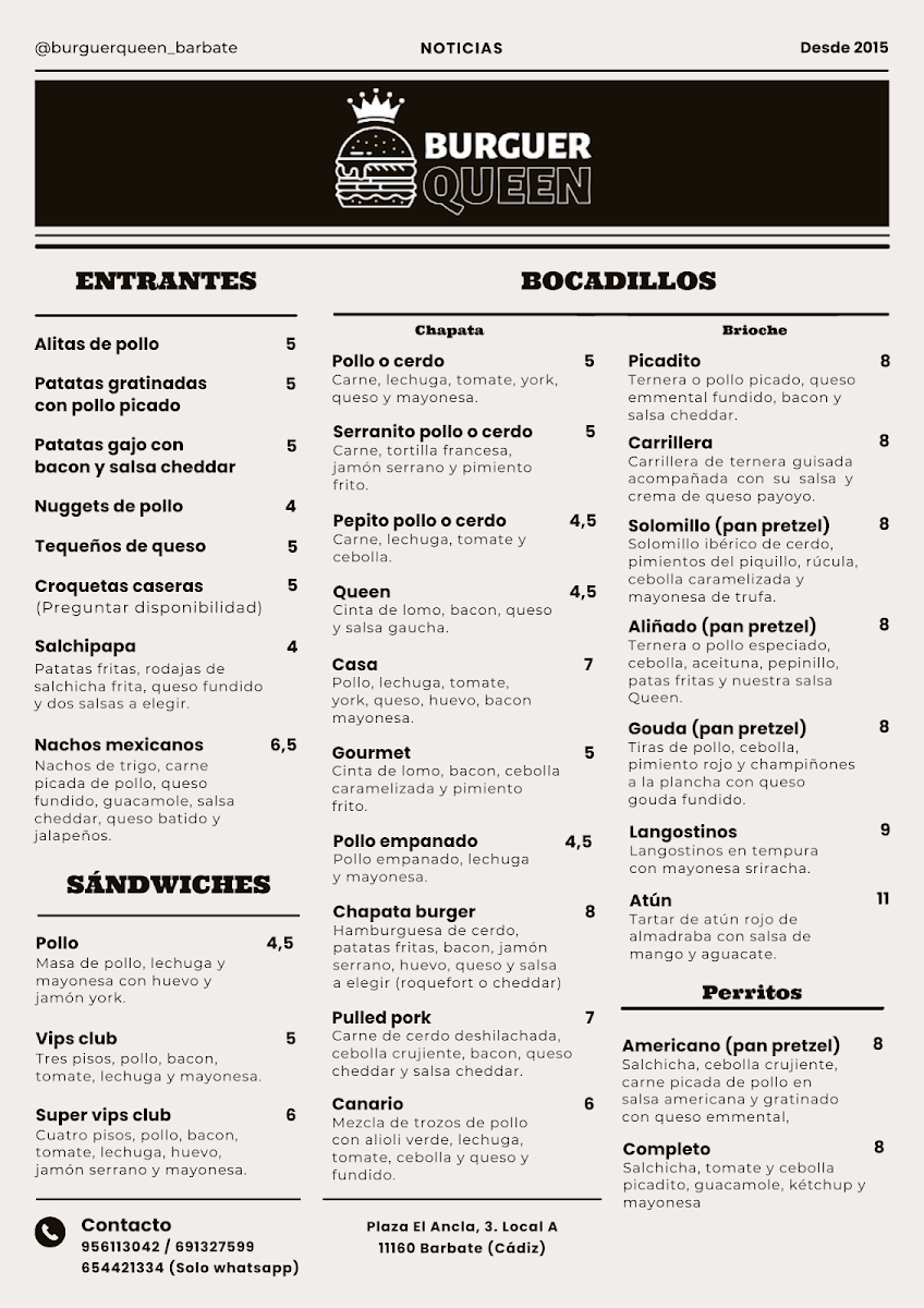 At Burguer Queen (Pl. el Ancla, 3, 11160 Barbate, Cádiz), the menu feels focused on hearty, crowd-pleasing burgers that lean into bold portions and satisfying flavors rather than unnecessary complexity. The standout Hamburguesa Extra is the kind of option that clearly targets anyone who wants a more filling, “go big” version of a classic burger experience-straightforward, indulgent, and built to leave you full. On the more distinctive side, the Hamburguesa de Cachopo brings a more regional, comfort-food personality to the lineup, offering a richer, more substantial bite that feels like it’s made for diners who want something beyond the standard burger format. Together, these highlights give the menu a clear identity: familiar burger fundamentals anchored by a couple of signature choices that make the selection feel intentional and easy to navigate.